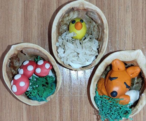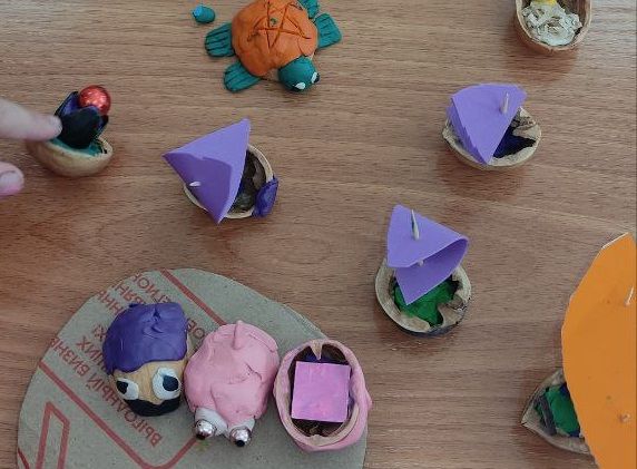 Воспитанники Службы помощи семье и детям Молчановского района с удовольствием изготовили объемные поделки из природного материала - скорлупы грецкого ореха.