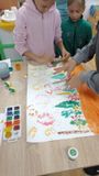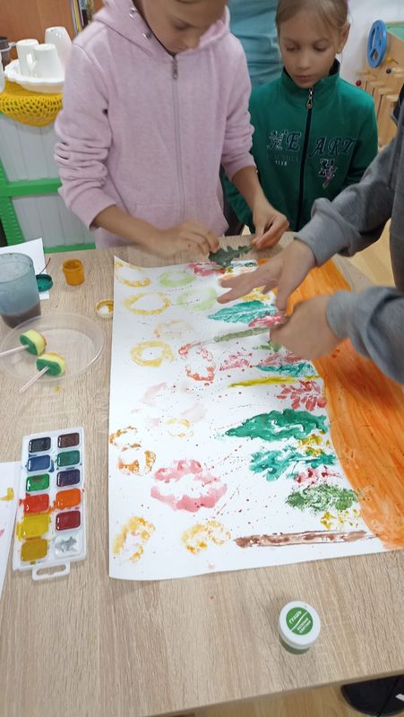 Ребята рисовали картину на тему осени методом оттиска осенних листьев, используя краски. Это занятие способствовало развитию художественных навыков и воображения.