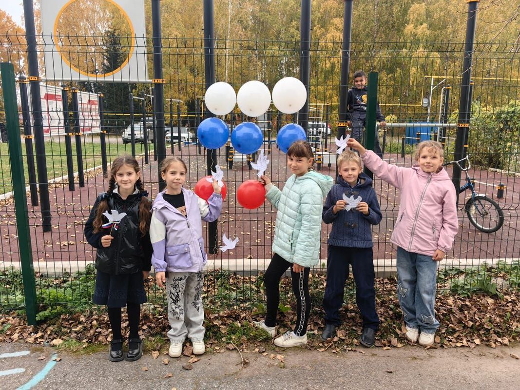 Ребята написали на бумажных голубях имена героев Великой Отечественной войны и прикрепили их к воздушным шарам белого, синего и красных цветов, разместив на территории Центра в виде флага РФ.