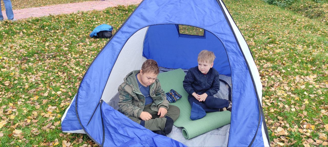 Началась «Туристская кругосветка». Участники семейного похода на первой станции «Разбивка лагеря» узнали о мерах безопасности, которые необходимо соблюдать, в том числе вблизи водоемов. Так как поход – это командная история, то и роли распределяются в данной команде: исследователи, хранители лагеря, хранители атмосферы, хранители впечатлений, спасатели и разведчики. Ребята с интересом делились своим мнением, примеряя командные роли на себе. Без костра не обходится не один поход, педагог рассказал о безопасности при разведении костра и предложил ребятам собрать разные виды костров. Задача была выполнена, и мы перешли к сборке палатки.