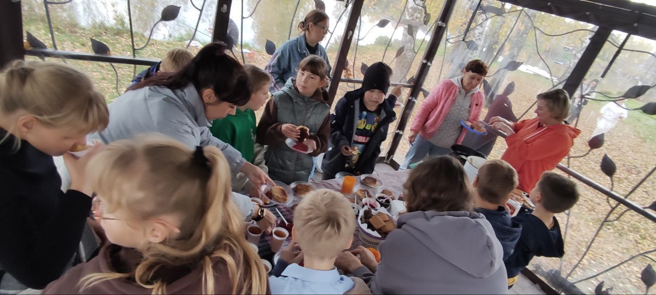 Завершающая и самая вкусная станция «Пикник». Пока ребята проходили кругосветку педагоги на свежем воздухе разогрели чай, напекли вкусных и пышных оладушек, накрыли стол. Дети и взрослые с удовольствием покушали на природе, обсудили насущные темы, насладились осенними видами, папы с ребятами успели наловить рыбы.