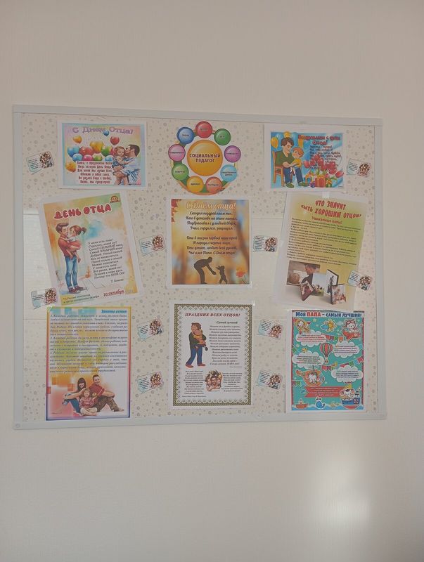 Кроме того, был оформлен информационный стенд, рассказывающий о значении отцовства, роли мужчины в воспитании ребёнка и важности участия папы в жизни семьи.