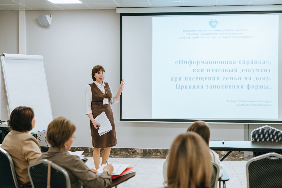 16-18 октября 2025 г. в г. Москве состоялась Творческая лаборатория проекта. В лаборатории принимали участие специалисты из 17 областей, которые представляли свои разработанные методические материалы. Алена Владимировна представляла проект «Информационная справка», как итоговый документ при посещении семьи на дому. Правила заполнения формы», который включал: представление презентации, рекомендаций к заполнению справки и представление кейс - упражнении. В своем выступлении Алена Владимировна представила опыт работы со «случаем» ОГКУ «ЦСПСиД Молчановского района» по работе с документом, его содержании и практическим применении. Мероприятие проходило в слаженной обстановке, участники охотно принимали участие в групповых упражнениях, делились опытом, профессиональными наработками.